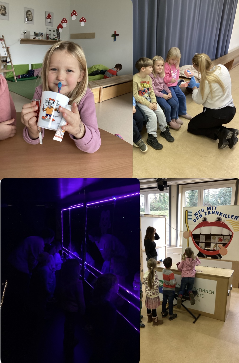 Am 18.11.2025 besuchte unsere Vorschulkinder den Karies-Tunnel. In kleinen Gruppen lernten die Kinder spielerisch, wie man richtig Zähne putzt. Nach dem Putzen bekamen sie eine spezielle Zahnfärbeflüssigkeit auf die Zähne und gingen durch den Schwarzlichttunnel, in dem sie genau sehen konnten, welche Stellen gut geputzt waren – und wo noch etwas fehlt.