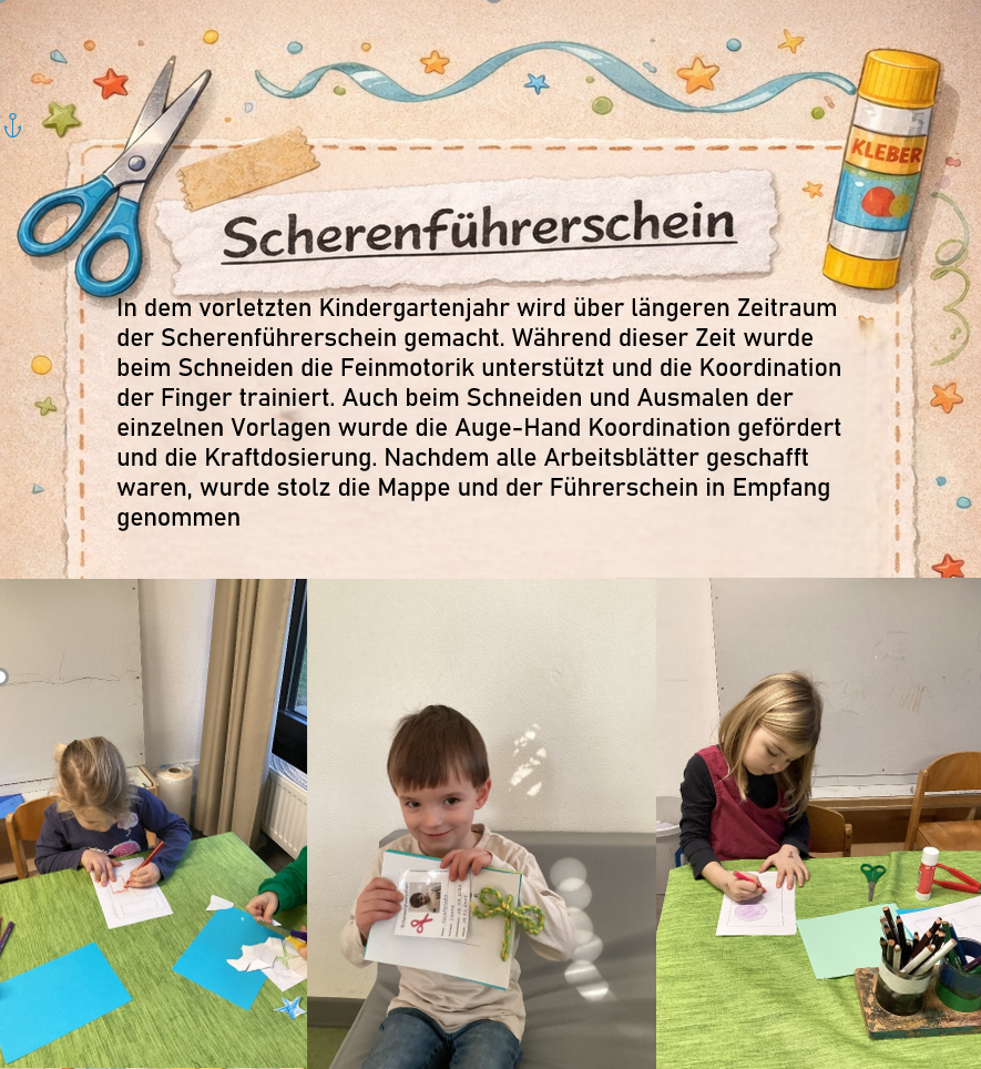 In dem vorletzten Kindergartenjahr wird über längeren Zeitraum der Scherenführerschein gemacht. Während dieser Zeit wurde beim Schneiden die Feinmotorik unterstützt und die Koordination der Finger trainiert. Auch beim Schneiden und Ausmalen der einzelnen Vorlagen wurde die Auge-Hand Koordination gefördert und die Kraftdosierung. Nachdem alle Arbeitsblätter geschafft waren, wurde stolz die Mappe und der Führerschein in Empfang genommen