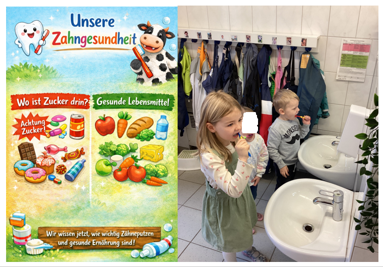 Heute hatten wir Besuch. Alles drehte sich um das Thema Zähneputzen und darum, in welchen Lebensmitteln Zucker enthalten ist. Eine Handpuppe namens Elsa war ebenfalls dabei. Sie zeigte den Kindern symbolisch, welche Flächen im Mund beim Zähneputzen gereinigt werden müssen. Anschließend ging jedes Kind selbst in den Waschraum, um sich – wie zuvor besprochen – die Zähne zu putzen.